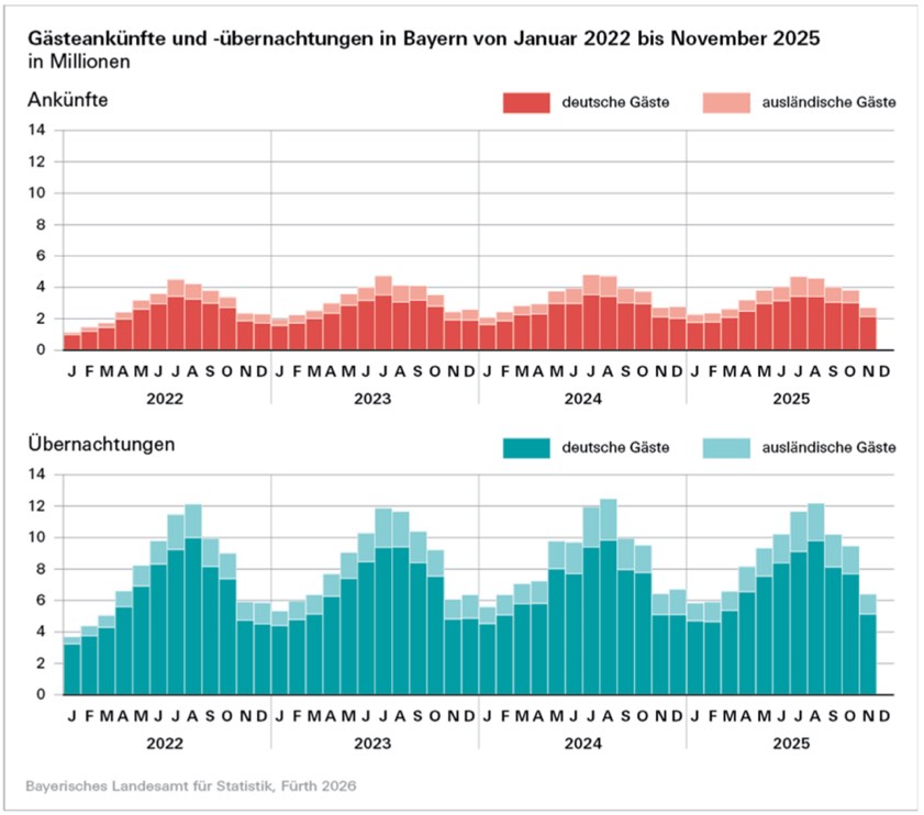 Mit rund 0,6 Millionen sank die Zahl der Gäste aus dem Ausland im November im Vergleich zum Vorjahres-Monat um 1,0 Prozent. Sie übernachteten knapp 1,3 Millionen Mal in einem bayerischen Beherbergungs-Betrieb. Das entspricht einem Rückgang um 4,0 Prozent. Bei Gästen aus Deutschland dagegen schien Bayern als Destination auch in der kalten Jahreszeit beliebt zu sein. Für diese Gruppe wurde ein leichter Zuwachs von 0,7 Prozent bei den Ankünften (2,1 Millionen) und 0,6 Prozent bei den Übernachtungen (5,1 Millionen) registriert.