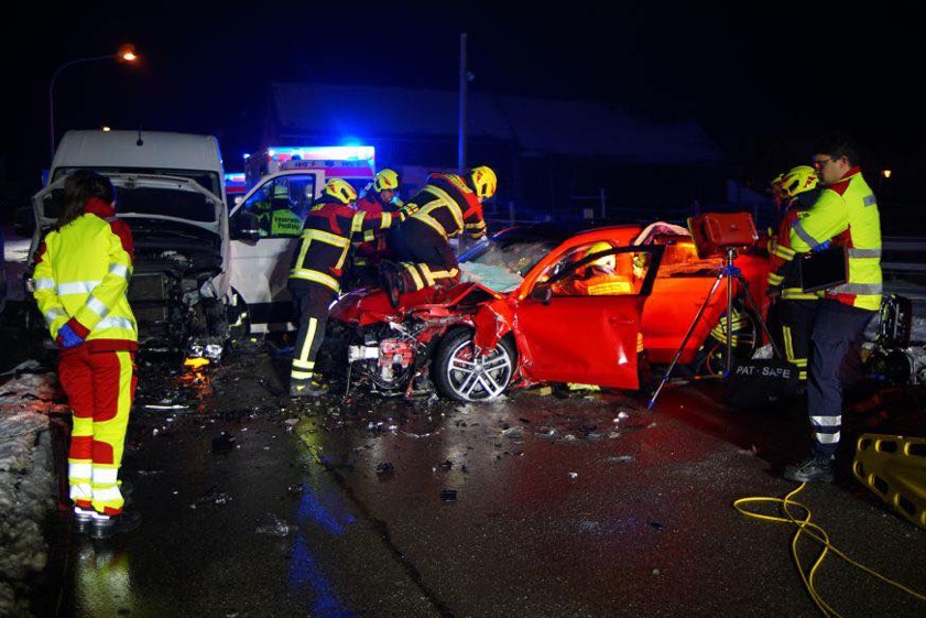 Laut Polizei war der 40 Jahre alte Rumäne mit seinem Auto auf der Kreisstraße R4 – von Bad Abbach her kommend – in Richtung Seedorf unterwegs. In der Ortschaft sei er mit seinem Pkw nach rechts von der Strecke geraten und habe zirka 100 Meter im gefrorenen Grünstreifen zurückgelegt; dabei sei auch der Zaun einer Pferdekoppel ramponiert worden. Bei dem Versuch, seinen Wagen wieder auf die Fahrbahn zu steuern, sei dieser auf die Gegenspur geraten und frontal mit dem entgegenkommenden Kleintransporter zusammenstoßen, in dem sich die beiden Deutschen befanden. Durch die Wucht des Aufpralls sei der Unfall-Verursacher schwer verletzt und in seinem Wrack eingeklemmt worden.