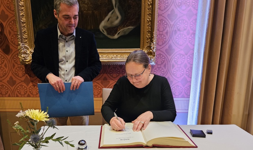 Unter den Augen von Bürgermeister Thomas Herker trägt sich Brigitte Menacher, die mit der bronzenen Stadtmedaille ausgezeichnet wurde, ins "Goldene Buch" der Stadt ein.