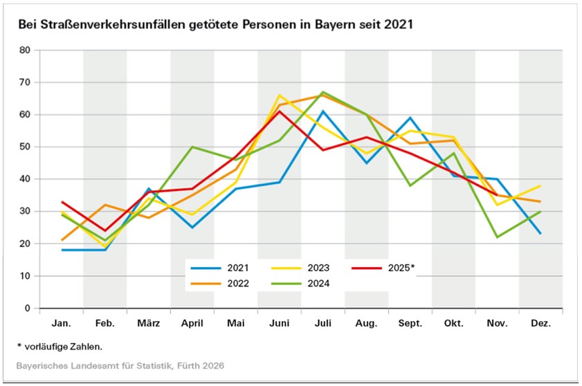 Nach Angaben der Behörde ist die Zahl der im bayerischen Straßenverkehr verunglückten Personen im November vergangenen Jahres um 12,7 Prozent auf 3702 gesunken. 35 Verkehrsteilnehmer seien ums Leben gekommen – 13 mehr als im Vorjahres-Monat. Die Zahl der Verletzten sei um 13,1 Prozent auf 3667 gesunken: 3271 Personen seien leicht verletzt worden (Vorjahres-Monat: 3696) und 396 schwer verletzt (Vorjahres-Monat: 522).