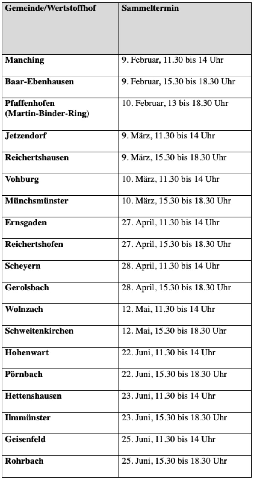 (ty) Der Abfall-Wirtschafts-Betrieb des Landkreises Pfaffenhofen (AWP) hat die Termine für die kostenlosen Problem-Abfall-Sammlungen bekannt gegeben, die heuer im ersten Halbjahr in den einzelnen Gemeinden angeboten werden. Eine detaillierte Übersicht finden Sie am Ende dieses Beitrags. Zudem gibt das Kommunal-Unternehmen erneut wichtige Hinweise zum Umgang mit speziellen Stoffen und erklärt, was im Rahmen der Sonder-Termine an den Wertstoffhöfen angenommen wird.