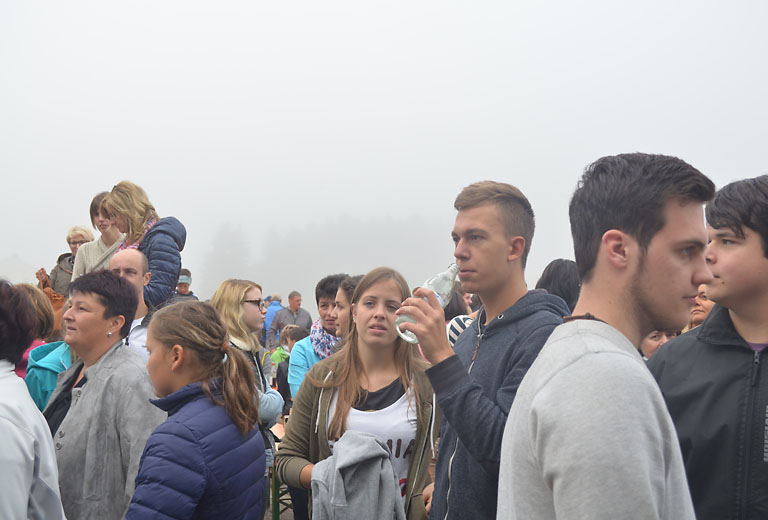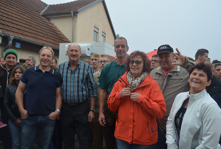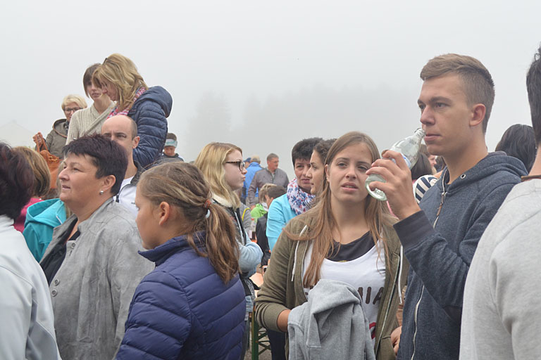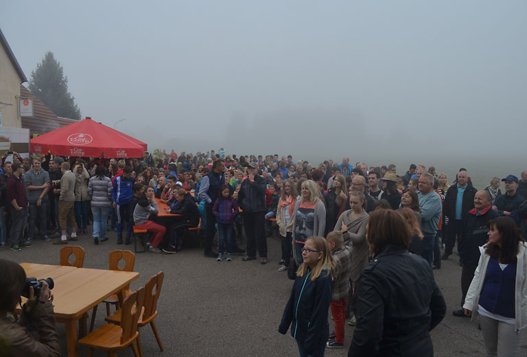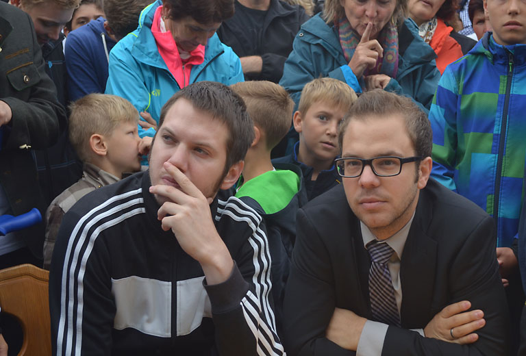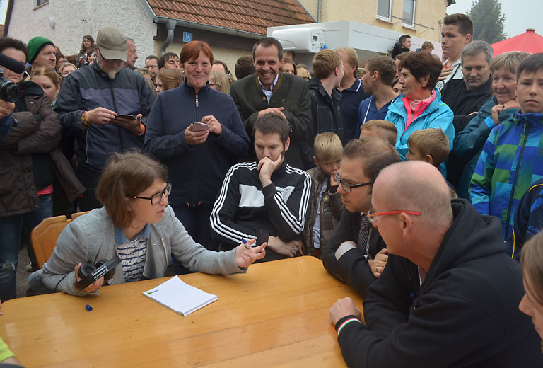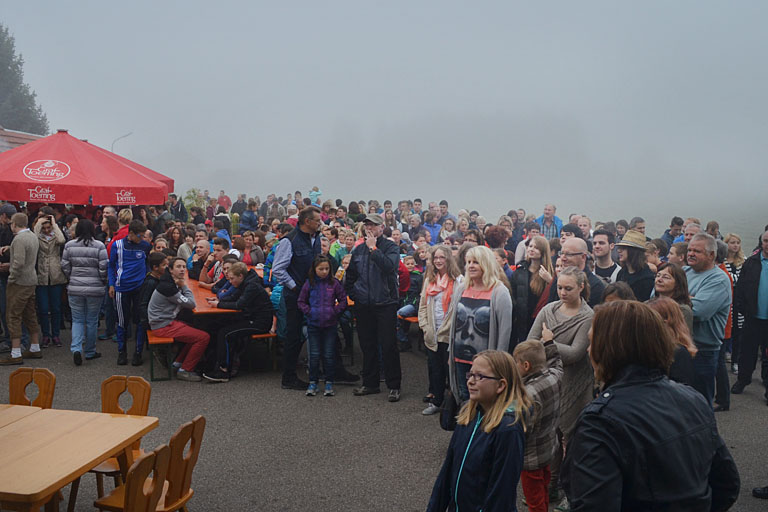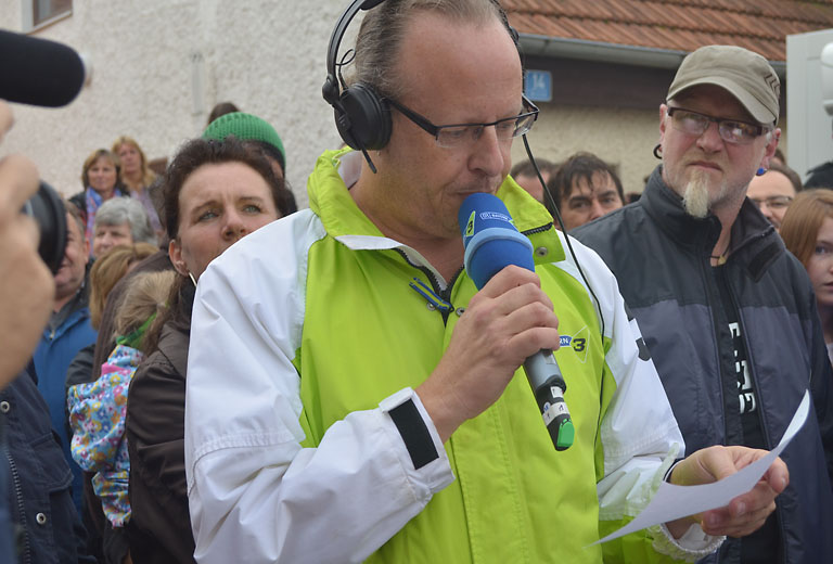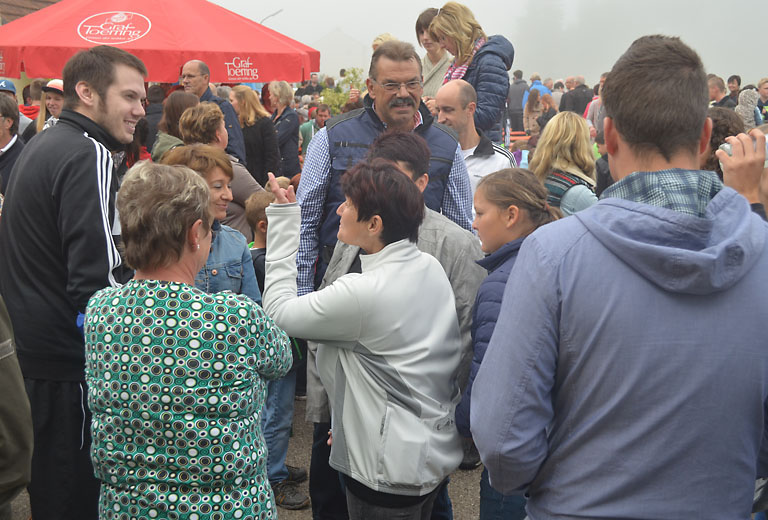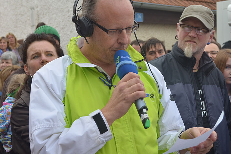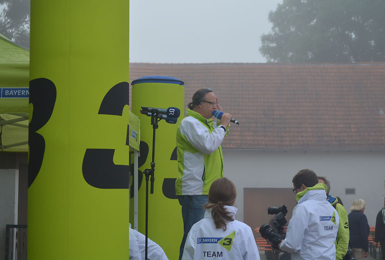 Bis um halb acht hat sich der Platz vor dem Mändlfelder Wirt dann gut gefüllt, freie Bierbänke gibt es kaum noch. Moderator Tom Glas heizt die Karlskroner schon mal auf und übt mit ihnen für die erste Liveschaltung. „Oberbayern, Oberbayern, hey! Hey!“, ruft die Menge mit einer einzigen Stimme. Die Gesichter gerötet vor Aufregung und Kälte, denn das Wetter meint es nicht unbedingt gut. Es ist neblig, nass und kalt. Dann um kurz nach acht Uhr endlich die erste Liveschaltung.