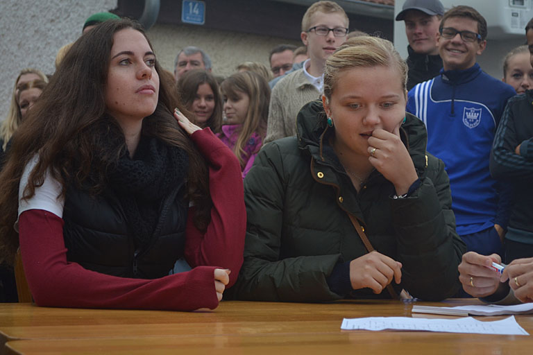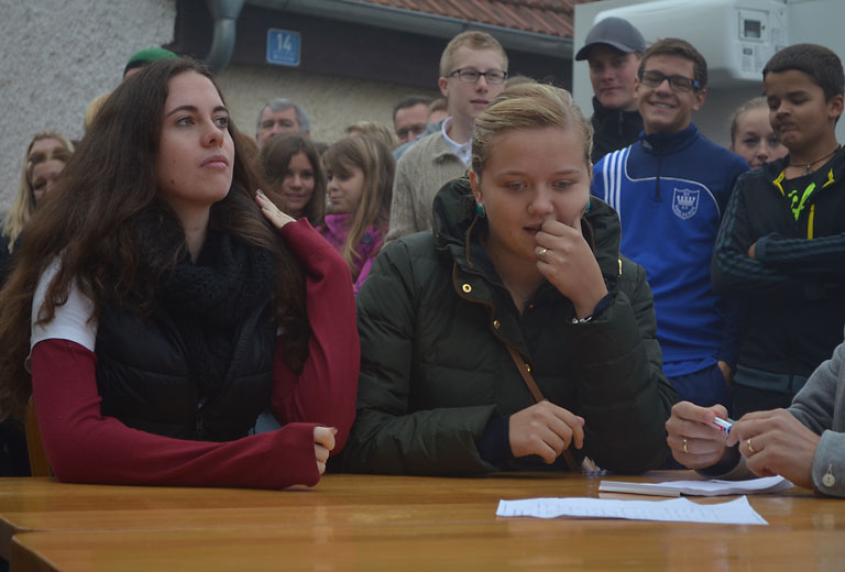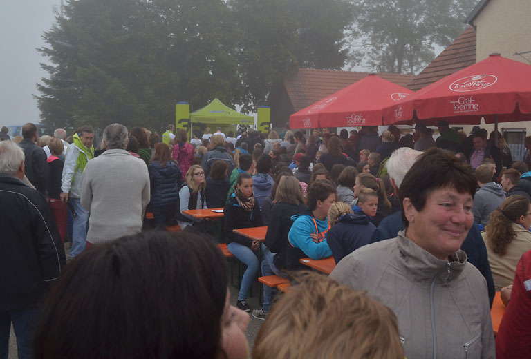 Die Menge plappert wild durcheinander und von „30 Sekunden“ bis „zwei Minuten“ ist wohl jede Antwort vertreten. Der Kandidat entschied sich schließlich für eine sportliche Zeit von 35 Sekunden. Zeitlarn entscheidet sich für 45. Es ist lange Zeit still, dann meldet sich Sebastian wieder. „Also die Simone hat gebraucht. Acht-und- . . .“ Er macht eine lange Pause. Niemand bewegt sich, alle schauen gespannt auf die Lautsprecher und hoffen, dass er endlich weiter spricht. „. . . -fünfzig Sekunden. Das bedeutet Zeitlarn ist weiter.“
