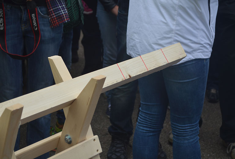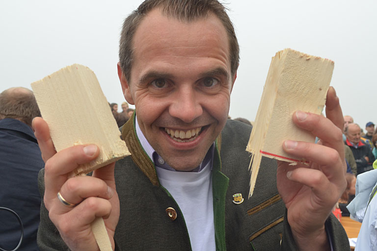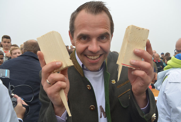 Dann melden sich die Bayern3-Reporter wieder und es geht in die nächste Liveschaltung. Die Stimmung ist fantastisch, das ganze Dorf jubelt für seine Kandidaten, man versteht kaum noch was in der Radio-Show gesprochen wird. Dann geht es los. Die Kandidaten positionieren sich und der erste fängt an zu sägen. Ratsch, ratsch, ratsch, durch. Das erste Stück Holz fällt nach weniger als fünf Sekunden. Als nächstes sind die starken Frauen dran. Die haben ein bisschen Schwierigkeiten. Aber auch bei ihnen fällt das Holz schnell. Schnell die Kleidung übergeben und das letzte Team ranlassen. Innerhalb weniger Sekunden fällt auch das letzte Stück, Tom kommt gar nicht mehr mit dem Moderieren hinterher. Er gibt nur durch „Wir sind fertig! Wir sind fertig!“ Zeitlarn ist es nicht. Karlskron hat gewonnen und bekommt seinen ersten Punkt. Gleichstand. Die Menge hüpft, schreit, tanzt, lacht. Die Minuten bis zum nächsten Spiel vergehen wie im Flug.