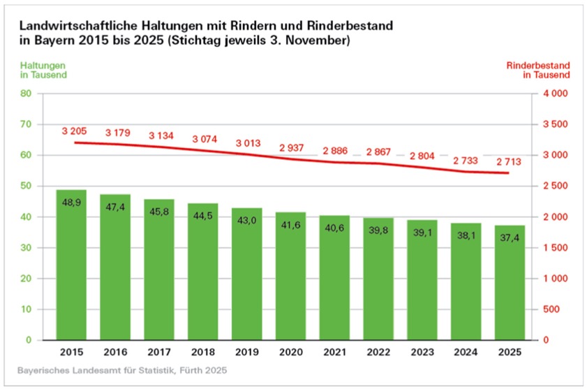 Den größten Anteil am gesamten bayerischen Rinder-Bestand hatten zum Stichtag mit 38,0 Prozent weiterhin die Milchkühe mit insgesamt 1 030 887 Tieren. Dieser Bestand blieb im Vergleich zum Vorjahr mit einem Minus von 0,5 Prozent (5 199 Tiere weniger) nahezu unverändert. Dem allgemeinen Trend in der Landwirtschaft folgend, ging die Zahl der Milchkuh-Haltungen mit einem Minus von 3,5 Prozent (779 Haltungen weniger) stärker zurück als der Bestand an Tieren. Damit zählte der Freistaat zum Stichtag insgesamt 21 676 Milchkuh-Haltungen. Höhere Rückgänge waren bei den Beständen von Rindern im Alter von mindestens zwei Jahren zu verzeichnen; hier nahmen die Bestände um 3,0 Prozent auf 195 629 Tiere ab.