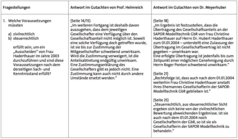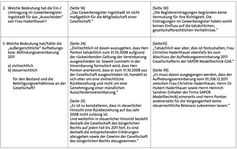 Die Rechtsexperten Helmreich und Meyerhuber betonen, der versuchte Verkauf des Unternehmens 2008 durch den Ehemann Dr. Hubert Haderthauer sei nicht wirksam geworden, da er gar nicht Eigentümer der Firma Sapor gewesen sei. Die Gutachter kommen ferner zu dem Ergebnis, dass die Veränderung von Eintragungen im Gewerberegister zur Firma Sapor Modellbau in Bezug auf die tatsächlichen Gesellschafterverhältnisse irrelevant seien. Sie hätten nur deklaratorischen Charakter und könnten eine Rechtsänderung nicht bewirken.