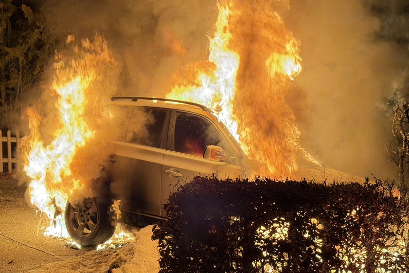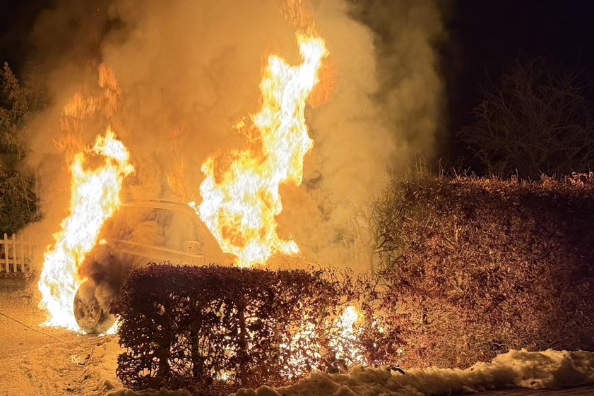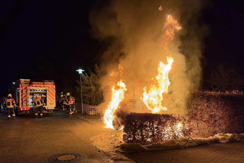(ty) Zum Raub der Flammen geworden ist ein Pkw in der Nacht zum heutigen Donnerstag im Gemeinde-Gebiet von Bad Abbach. Wie die örtlich zuständige Polizeiinspektion aus Kelheim berichtet, kam es gegen 1.25 Uhr in der Straße "Am Rosenberg" im Ortsteil Poikam zu dem Feuer – "vermutlich aufgrund eines technischen Defekts". Der in Brand geratene Wagen sei in eine Hecke gerollt, die daraufhin ebenfalls Feuer gefangen habe. Streifenbeamte siedelten den entstandenen Sachschaden im unteren vierstelligen Euro-Bereich an. Die Floriansjünger aus Poikam, Lengfeld und Bad Abbach kümmerten sich um die Lösch-Maßnahmen.
