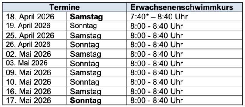 (ty) Die Wasserwacht-Ortsgruppe von Manching bietet in diesem Jahr wieder den Anfänger-Schwimmkurs für Erwachsene und Jugendliche ab einem Alter von 14 Jahren an. Dieser findet der Ankündigung zufolge an Wochenenden statt, beginnt am 18. April und umfasst insgesamt zehn Ausbildungs-Einheiten mit einer "Wasserzeit" von jeweils 40 Minuten. Die Teilnahme koste 140 Euro pro Person. Als Ziele werden das Gewöhnen ans Wasser und das Erlernen von Schwimm-Begegungen in Brust-Technik genannt.