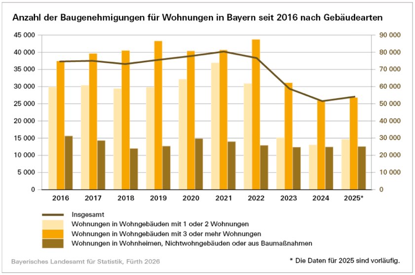 Der Blick auf die Regierungsbezirke zeigt für Schwaben und Oberbayern einen Rückgang der Wohnungsbau-Genehmigungen, der sich prozentual noch im einstelligen Bereich bewegt. In den anderen Bezirken lag ein Anstieg der Baugenehmigungen vor. Am stärksten war der Zuwachs in Mittelfranken, dort betrug das Plus 42 Prozent beziehungsweise 2380 zusätzliche Genehmigungen. Auf der Landkreis-Ebene verzeichneten die kreisfreien Städte im Vergleich zum Vorjahr keine Veränderung. In den Großstädten gingen die Baugenehmigungen um 5,3 Prozent zurück, in den Landkreisen stiegen sie um 7,7 Prozent.