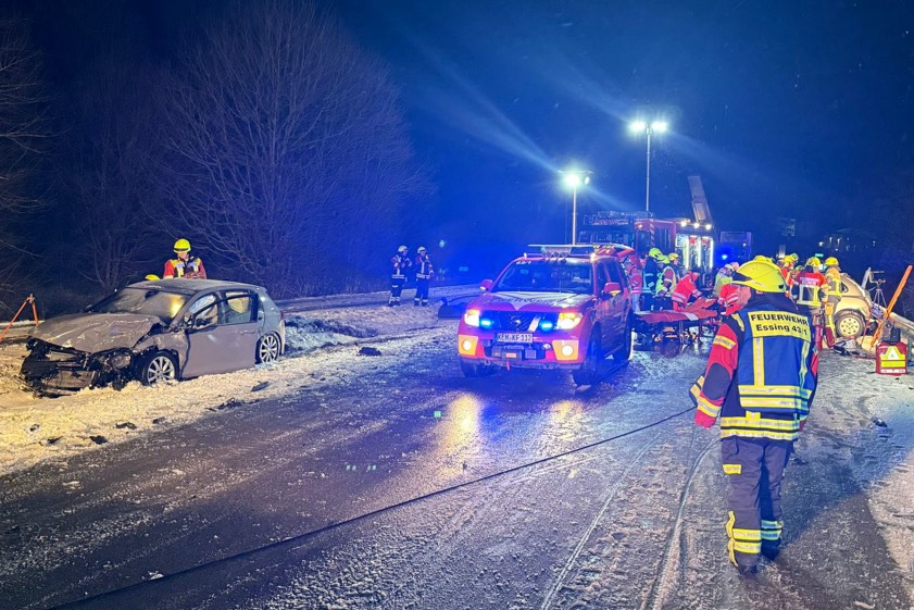 (ty) Zwei schwer verletzte Personen und eine leicht verletzte Person sowie zwei demolierte Autos – das ist die Bilanz eines heftigen Verkehrsunfalls, der sich am gestrigen Morgen im Gemeinde-Bereich von Essing (Kreis Kelheim) ereignet hat. Wie die Polizei heute berichtet, war ein 46-Jähriger mit seinem Pkw auf der Staatsstraße 2230 – von Essing her kommend – in Richtung Kelheim unterwegs, als es gegen 5.50 Uhr zu dem Unglück kam. Sein Wagen sei auf der schneeglatten Strecke ins Rutschen geraten und auf die Gegenspur gelangt.