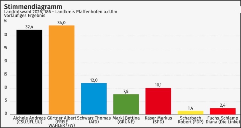 Im Rennen um den Chef-Posten im Landratsamt von Pfaffenhofen kam Bettina Markl (Grüne) aus Baar-Ebenhausen heute auf 7,8 Prozent, der SPD-Frontmann Markus Käser aus Pfaffenhofen konnte 10,1 Prozent der Stimmen auf sich vereinen. Sowohl Markl als auch Käser sind bekanntlich auch Kreis-Vorsitzende ihrer Partei. Robert Scharbach, den die FDP als Landrats-Kandidaten aufgeboten hatte, musste sich mit niederschmetternden 1,4 Prozent begnügen, für Diana Fuchs-Schlamp (Linke) aus Scheyern votierten 2,4 Prozent der Stimmberechtigten. Die Wahlbeteiligung lag bei 65,9 Prozent.