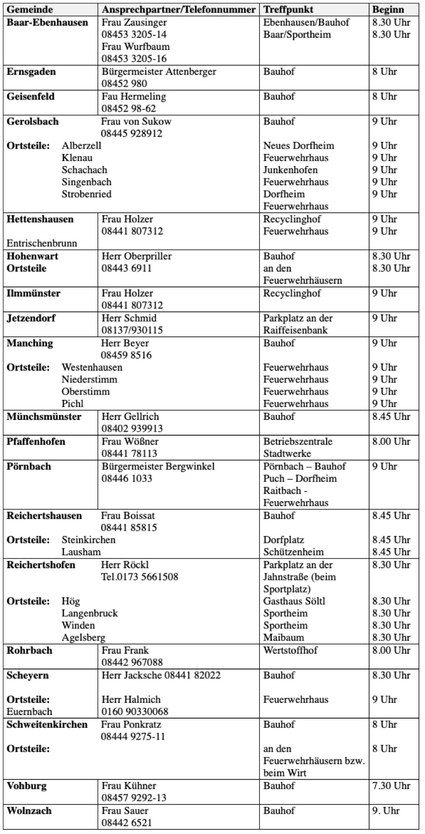 Hier die Treffpunkte, Startzeiten und Ansprech-Partner in den einzelnen Gemeinden im Überblick. AWP spendiert den Kommunen zehn Euro pro Teilnehmer.