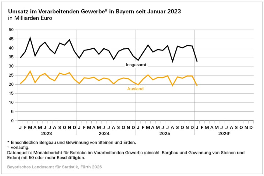 Wie die Behörde weiter mitteilt, entfielen von den 32,5 Milliarden Euro des im Januar registrierten gesamten Umsatzes rund 19,2 Milliarden Euro auf Umsätze mit dem Ausland (minus 3,0 Prozent) und darunter rund 6,6 Milliarden Euro auf Umsätze mit den Ländern der Euro-Zone (minus 4,9 Prozent). Die Anteile der Auslands-Umsätze und der Umsätze mit den Euro-Zonen-Ländern am Gesamt-Umsatz machten 59,0 beziehungsweise 20,4 Prozent aus. Damit lagen sie geringfügig unter dem Niveau vom Januar 2025 (59,3 beziehungsweise 20,9 Prozent).