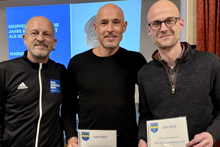 (ty) Zwei verdiente Fußball-Schiedsrichter sind von Michael Seidl (Foto, links), dem Obmann der Schiri-Gruppe Pfaffenhofen, im Rahmen der jüngsten Monats-Versammlung für jeweils zehnjährige aktive Tätigkeit auszeichnet worden. Markus Schreiner (TSV Etting, Mitte) ist im Anschluss an seine langjährige Karriere als aktiver Fußballer auf hohem Niveau nun als Unparteiischer tätig; Andreas Rauh (SpVgg 62 Straubing) wechselte vor einigen Jahren aus Niederbayern zur Schiedsrichter-Gruppe nach Pfaffenhofen und ist zusätzlich auch als Beobachter und Pate aktiv.