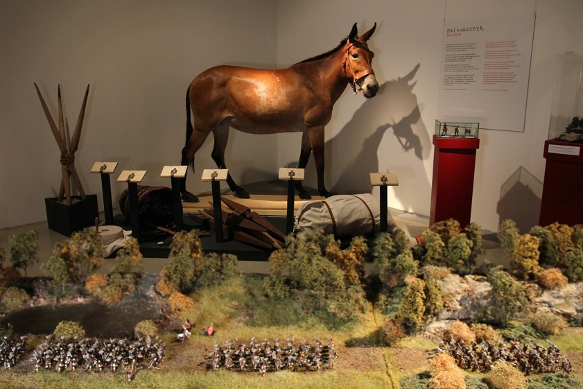 Blick in die Ausstellung mit Marsch-Diorama und Maultier Renate.
