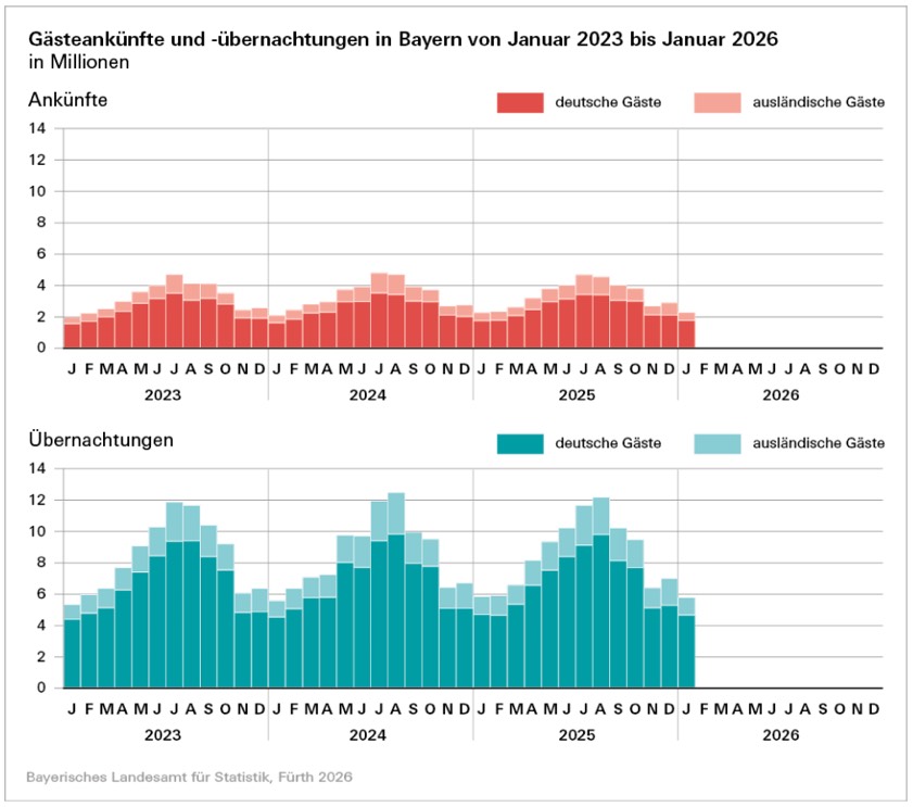 Beim Januar-Ergebnis waren rund 1,8 Millionen Ankünfte (plus 0,5 Prozent) und rund 4,7 Millionen Übernachtungen (minus 0,6 Prozent) Gästen aus Deutschland zuzuordnen, während gut 0,5 Millionen (plus 1,6 Prozent) Reisende aus dem Ausland der bayerischen Beherbergungs-Branche etwas mehr als 1,1 Millionen (minus 1,8 Prozent) Übernachtungen einbrachten. Damit lag der Anteil internationaler Gäste bei rund 22,8 Prozent und der Anteil der Inländer bei 77,2 Prozent.