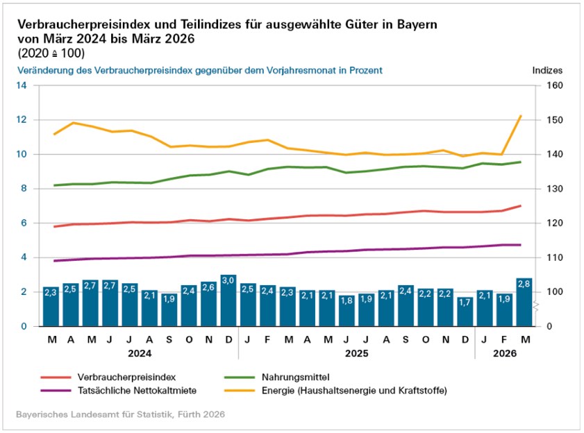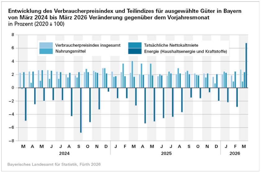 (ty) Im Freistaat sind die Verbraucher-Preise im zu Ende gehenden März gegenüber dem Vorjahres-Monat um 2,8 Prozent gestiegen. Das wurde am heutigen Montag aus dem bayerischen Landesamt für Statistik bekannt gegeben. Den Angaben zufolge kosten Nahrungsmittel aktuell 1,0 Prozent mehr als vor einem Jahr; die Preise für Energie (Haushaltsenergie und Kraftstoffe) kletterten im Vergleich zum Vorjahres-Monat um 6,8 Prozent. Im Vergleich zum Vormonat Februar erhöhte sich der Verbraucher-Preis-Index um 1,2 Prozent. Nachfolgend weitere Details – auch zu einzelnen Waren – sowie drei Grafiken.