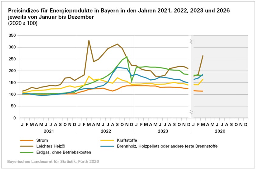 Im Vorjahres-Vergleich liegen die Preise für Energie im zu Ende gehenden März um 6,8 Prozent über den Preisen von März vergangenen Jahres. Der Preis für Heizöl kletterte spürbar um 44,8 Prozent gegenüber März vergangenen Jahres. Auch der Preis für Kraftstoffe ist im zu End gehenden März gegenüber dem Vorjahres-Monat stark gestiegen (plus 19,7 Prozent). Brennholz, Holzpellets oder andere feste Brennstoffe wurden im Vorjahres-Vergleich ebenfalls deutlich teurer (plus 25,3 Prozent). Strom (minus 6,6 Prozent) und Erdgas (minus 4,2 Prozent) können dagegen derzeit günstiger bezogen werden.
