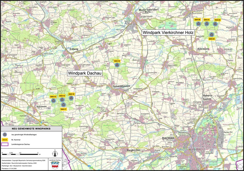 Der "Windpark Vierkirchner Holz" umfasst nach heutiger Mitteilung der Landkreis-Behörde vier Windkraft-Anlagen und erstreckt sich auf die Gemarkungen Röhrmoos, Biberbach und Schönbrunn. Der "Windpark Dachau" in Sulzemoos/Schwabhausen zähle fünf Windkraft-Anlagen auf den Gemarkungen Sulzemoos, Oberroth und Schwabhausen. "Sämtliche Standorte befinden sich innerhalb künftig vorgesehener Vorrang-Gebiete für Wind-Energie", heißt es weiter. Die Genehmigungs-Bescheide werden laut Behörde nach den Ostertagen auf der Inter-Seite des Landratsamts von Dachau mit weiteren Informationen zu Einsichts-Möglichkeiten vor Ort unter diesem Link veröffentlicht.