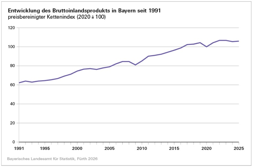 Mit der Veröffentlichung der Ergebnisse für das Vorjahr werden laut Landesamt für Statistik turnusgemäß auf Basis einer verbesserten Daten-Grundlage auch revidierte Ergebnisse für das Vorvorjahr bereitgestellt. Demnach ist das bayerische Bruttoinlandsprodukt im Jahr 2024 nominal zwar um 1,8 Prozent gestiegen preisbereinigt ergab sich jedoch ein Rückgang der Wirtschafts-Leistung um 1,3 Prozent.