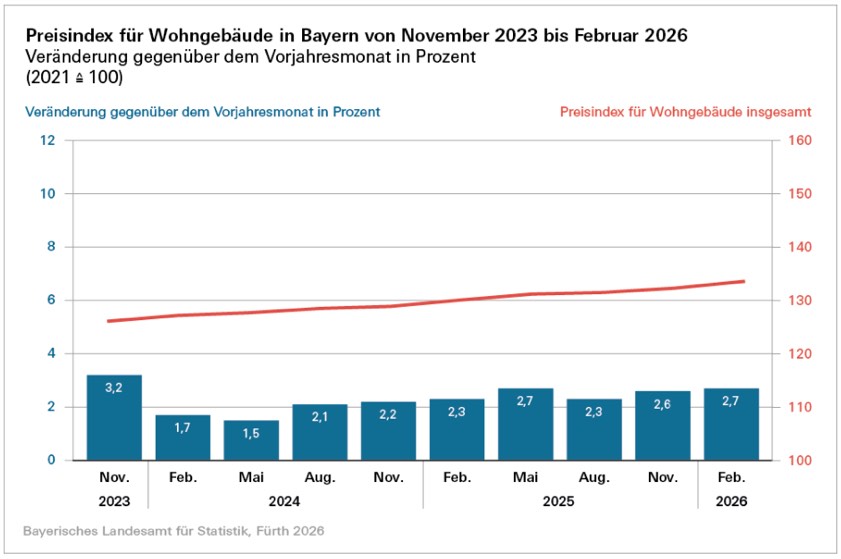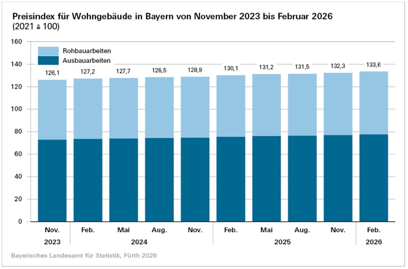 (ty) Wie das bayerische Landesamt für Statistik mitgeteilt hat, stieg der Preis-Index für den Neubau von Wohngebäuden im Februar heuer im Vergleich zum Vorjahres-Monat um 2,7 Prozent. Gegenüber der Erhebung im November vergangenen Jahres legten die Baupreise um 1,0 Prozent zu. Für Rohbau-Arbeiten ermittelten die Fachleute um 2,3 Prozent höhere Preise als im Vorjahres-Monat. Bei den Ausbau-Arbeiten verzeichneten sie einen Anstieg von 3,0 Prozent im Vorjahres-Vergleich. Seit 2021, dem aktuellen Basisjahr der Statistik der Bauleistungs-Preise, sind die Preise für den Neubau von Wohngebäuden im Freistaat um 33,6 Prozent gestiegen. Die Preise für Rohbau-Arbeiten sind in diesem Zeitraum um 26,2 Prozent und die Preise für Ausbau-Arbeiten sogar um 39,4 Prozent geklettert.