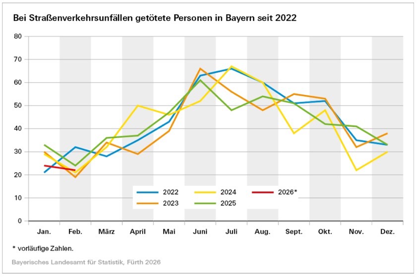 (ty) Wie das bayerische Landesamt für Statistik nach vorläufigen Ergebnissen der Polizei heute mitgeteilt hat, erhöhte sich die Zahl der Straßenverkehrsunfälle im Freistaat im Februar dieses Jahres im Vergleich zum Vorjahres-Monat um 10,6 Prozent – und zwar von 25 050 auf 27 693. Nach Angaben der Behörde kamen bei 2263 dieser 27 693 Unfälle Personen zu Schaden. Das entspricht einem Rückgang der "Unfälle mit Personenschaden" um 8,0 Prozent gegenüber Februar vergangenen Jahres. 22 Menschen kamen heuer im Februar in Bayern bei einem Verkehrsunfall ums Leben; im Vorjahres-Monat waren es 24.