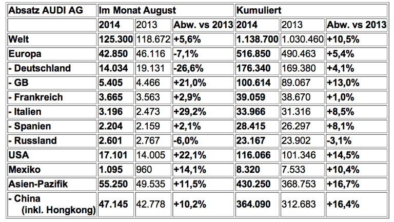 Auch Brasilien legte im August ein hohes Wachstumstempo vor. Mit 1172 Autos und einem Plus von 58,6 Prozent gegenüber dem Vorjahresmonat baute Audi seine Marktpräsenz weiter aus. In Deutschland verzeichnete Audi ein Minus von 26,6 Prozent gegenüber dem starken Vergleichswert 2013. Seit Januar übernahmen damit 176 340 deutsche Kunden ihren neuen Audi, plus 4,1 Prozent. In Italien steigerte das Unternehmen seine Verkäufe im August um 29,2 Prozent. Auch das Absatzvolumen in Großbritannien stieg mit einem Zuwachs von 21,0 Prozent gegenüber dem Vergleichsmonat deutlich an. Die Verkäufe des Audi A3 legten im gleichen Zeitraum sogar um 63,5 Prozent zu. Mit 1676 Auslieferungen war das Kompakt‑Modell der Bestseller von Audi. Seit Jahresbeginn wurden auf dem britischen Markt insgesamt 100 614 Audi in Kundenhand übergeben.