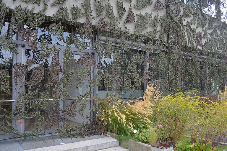 Der erste Teil der Verwandlung – das Blättergewand – ist bereits an der Fassade der Theaters angebracht