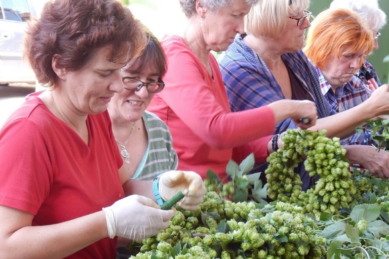 „So viele Interessierte wie diesmal waren noch nie da“ erklärte Rita Sedlmayr, die das Hopfenkranzbinden schon seit einigen Jahren am ersten Samstag im September auf ihrem Hof anbietet. „Besonders habe ich mich über die zusätzliche Vermarktung durch das Kommunalunternehmen für Strukturentwicklung im Landkreis Pfaffenhofen gefreut“, so Sedlmayr. Sogar aus München waren Gäste angereist. Gegen einen Kostenbeitrag von zehn Euro durften die Anwesenden so viele Kränze binden wie es der vorhandene Hopfen zuließ.