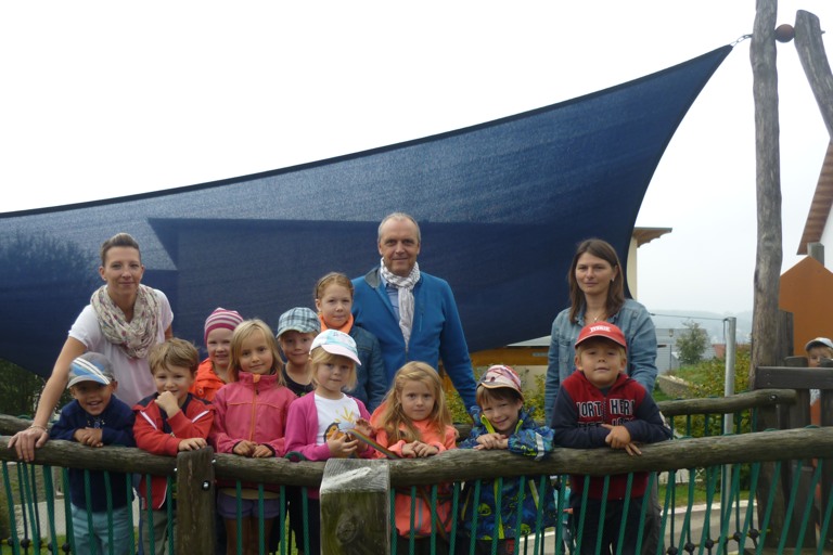 Kita-Leiterin Andrea Mischke (links), Erzieherin Micha Grametbauer (rechts) und Kinder der Kita „Burzlbaam“ bedankten sich bei Gottfried Klösel von der Firma Weisenfeld GmbH für das neue Sonnensegel. Foto: Verena Flammensbeck