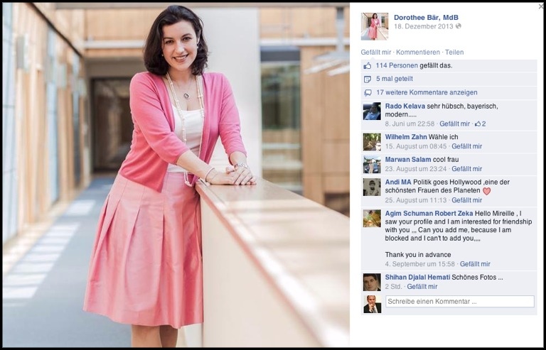 So fesch zeigt sich Dorothee Bär (CSU) auf ihrer Facebook-Seite. Jetzt trug sie im Bundestag ein rosa Dirndl, was einer Grünen-Kollegin nicht passte.