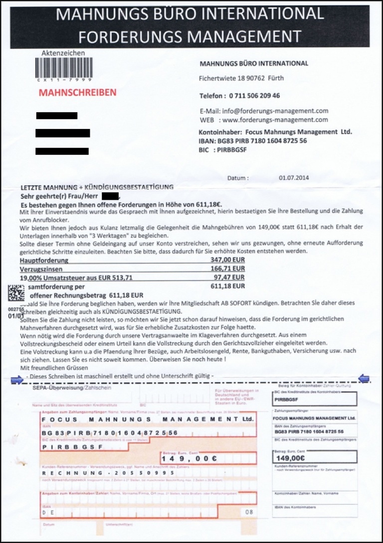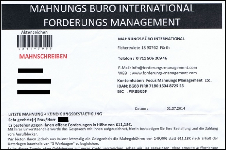 Hier ein Beispiel für ein betrügerisches Mahnschreiben: