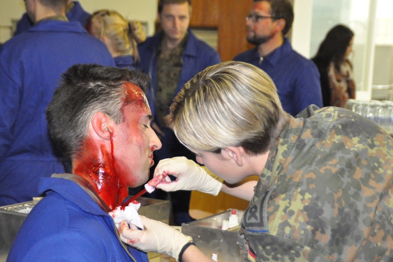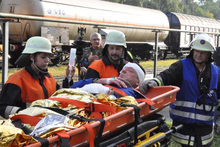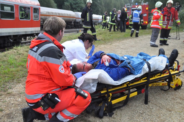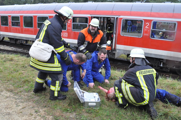 Als die Feuerwehren an der Unglücksstelle eintreffen, dringen aus dem Zug bereits die Hilfeschreie der Passagiere nach draußen. Von der Bundeswehr authentisch geschminkte Verletzten-Darsteller beklagen Knochenbrüche, abgetrennte Gliedmaßen, blutige Wunden und irren im Schockzustand umher. Den Rettern bietet sich eine realistisch anmutende Szenerie. Nach und nach werden die Opfer von der Feuerwehr geborgen. BRK-Notärzte und Sanitäter kümmern sich um die medizinische Notfallversorgung. Dazu wird extra ein Lazarett-Zelt errichtet. Beobachter, unter anderem von der Feuerwehrschule Geretsried, dokumentieren die Rettungsmaßnahmen.