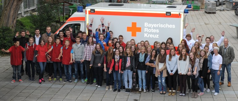 (ty) Rund 60 Ersthelfer-Schüler aus der Georg-Hipp-Realschule und aus umliegenden Schulen übten die Reanimation zum "Disco-Beat". Bei "Stayin alive" von den Bee Gees kamen sie ordentlich ins Schwitzen. Denn es braucht viel Kraft, bis die Reanimations-Übungs-Puppe durch ein Geräusch anzeigt, dass ausreichend gedrückt wird. Die Merkworte für Ersthelfer „prüfen, rufen, drücken“ der bundesweiten Kampagne „ein Leben retten“ wurden von Lukas Pfundheller von der Ilmtalklinik erläutert. Er motivierte die Schüler zur aktiven Hilfe beim Herzstillstand. Denn rund 10 000 Menschen sterben jährlich, weil ihnen nicht rechtzeitig geholfen wird. Bei der anschließenden Besichtigung des Rettungswagen des Bayerischen Roten Kreuzes waren sich die Schüler schnell einig, dass lebensrettende Erste-Hilfe-Maßnahmen nicht erst Thema beim Führerschein werden sollten und jeder wissen müsse, was beim Herzstillstand zu tun ist. (Foto: Tobias Tschepe)