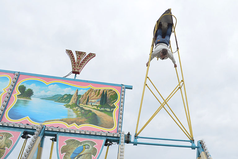Beide stellen mit Bedauern das Aussterben dieses alten, traditionellen Fahrgeschäfts fest. „Oba scheh is scho“, meinte Fritz Kreis junior zu seinem Vater, als nach dem 40-Cent-Eröffnungstag genau null Euro in der Kasse waren. „Ich habe mit dem Überschlagschaukeln angefangen, nachdem ich über einen Schiffschaukler mit über 2000 Überschlägen in der Zeitung gelesen habe“, schildert Ettinger den Beginn seiner Leidenschaft. „Vielleicht geht das ja bei anderen auch.“