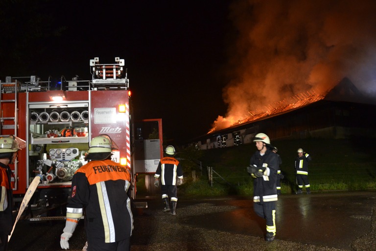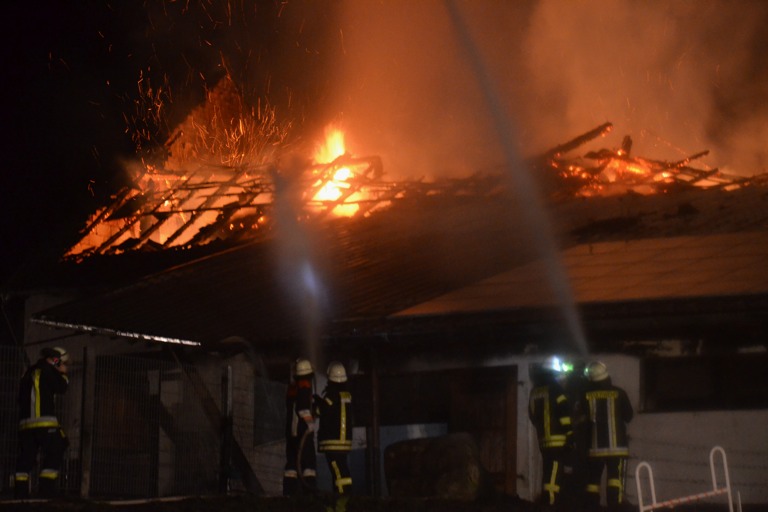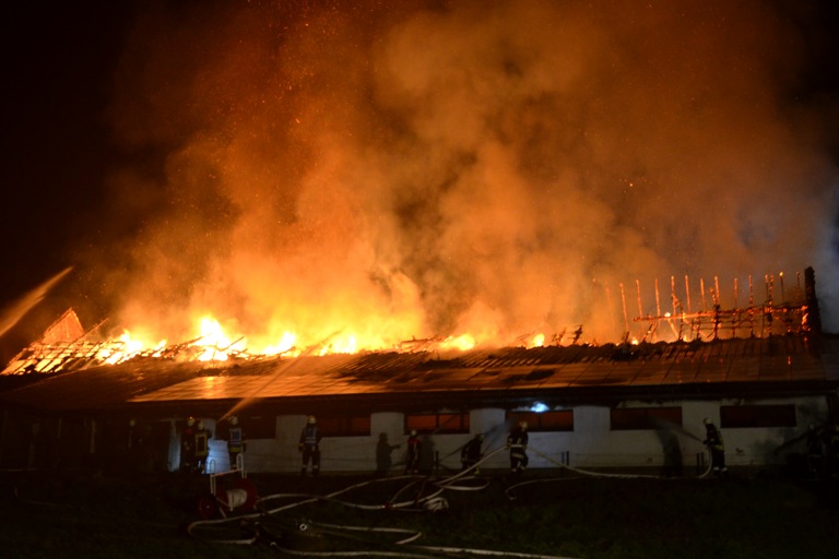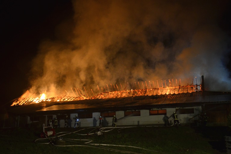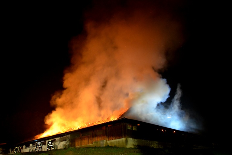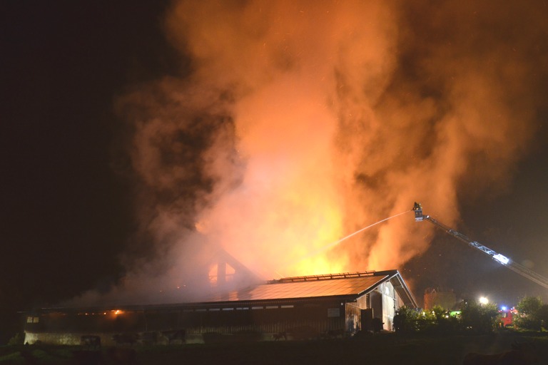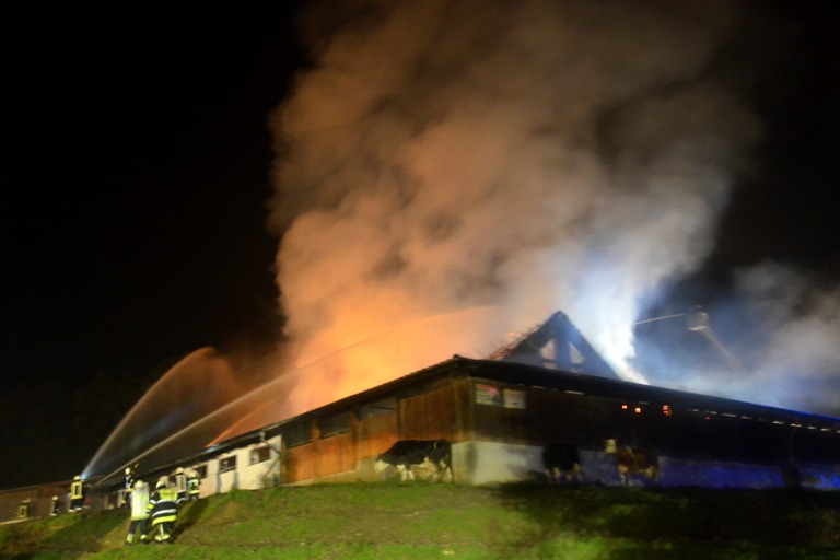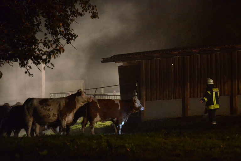 Den Helfern bot sich am Einsatzort ein infernalisches Bild: Flammen schlugen weithin sichtbar in den Nachthimmel, Gebrüll von Rindern drang durch die Nacht. Die Tiere waren völlig verängstigt, liefen wild durch die Gegend, mussten beruhigt und wieder eingefangen werden. Ein junges Rind schlüpfte in Panik durch den Drahtzaun, der das Areal umgibt, hüpfte verstört über die Straße. Dicke Rauchwolken stiegen in den Nachthimmel, der Dachstuhl des Gebäude – eine Stallung – brach in sich zusammen.