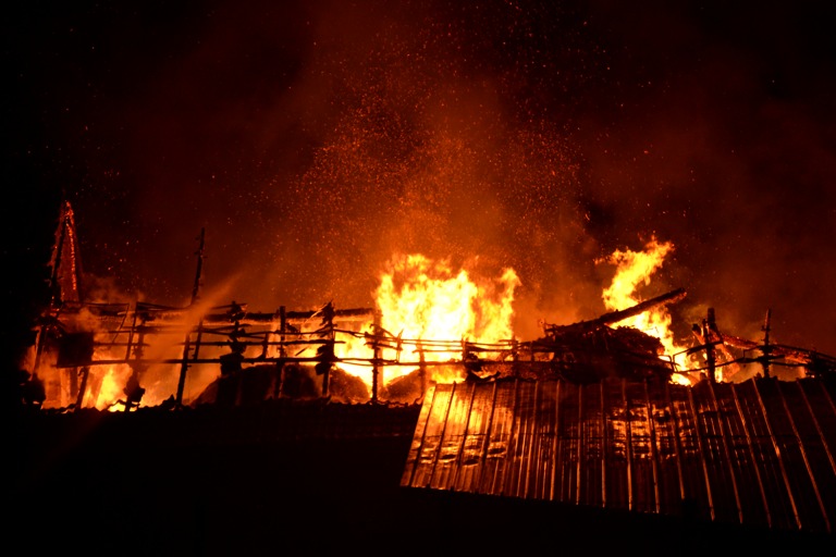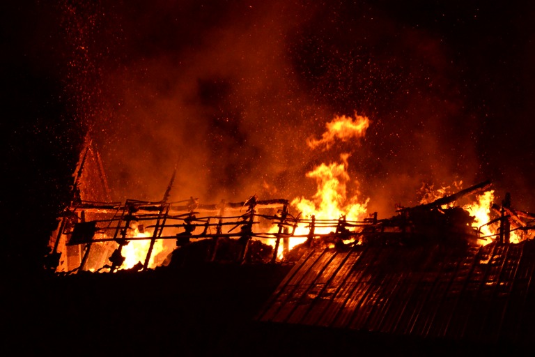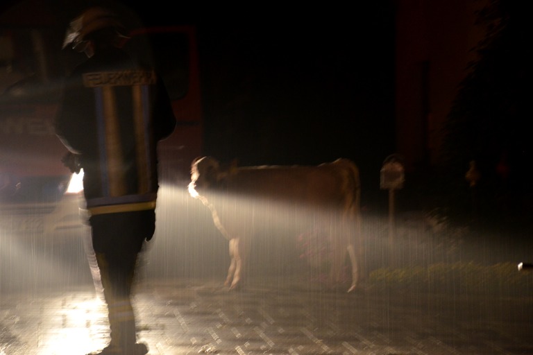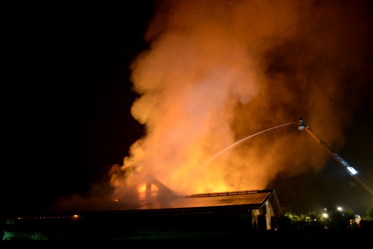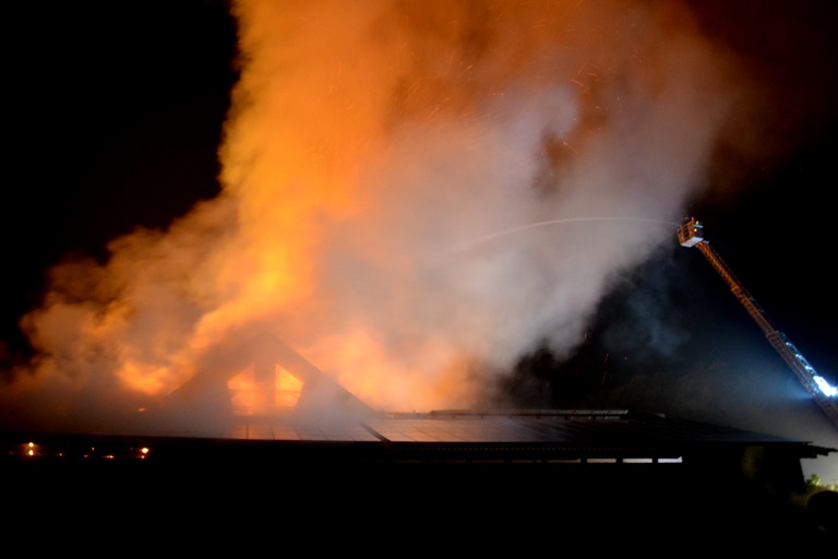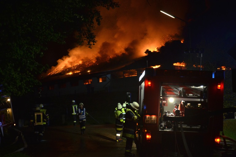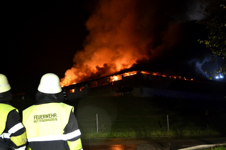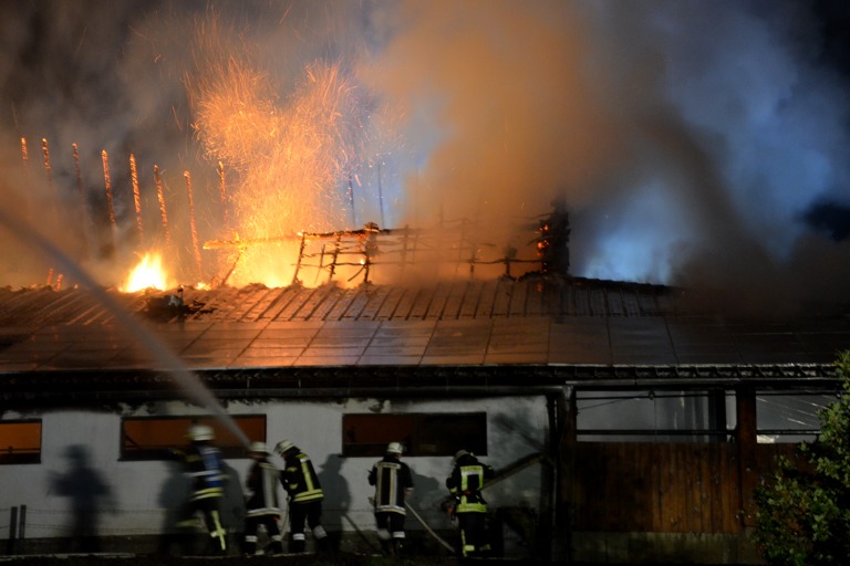 Den Helfern bot sich am Einsatzort ein infernalisches Bild: Flammen schlugen weithin sichtbar in den Nachthimmel, Gebrüll von Rindern drang durch die Nacht. Die Tiere waren völlig verängstigt, liefen wild durch die Gegend, mussten beruhigt und wieder eingefangen werden. Ein junges Rind schlüpfte in Panik durch den Drahtzaun, der das Areal umgibt, hüpfte verstört über die Straße. Dicke Rauchwolken stiegen in den Nachthimmel, der Dachstuhl des Gebäude – eine Stallung – brach in sich zusammen.
