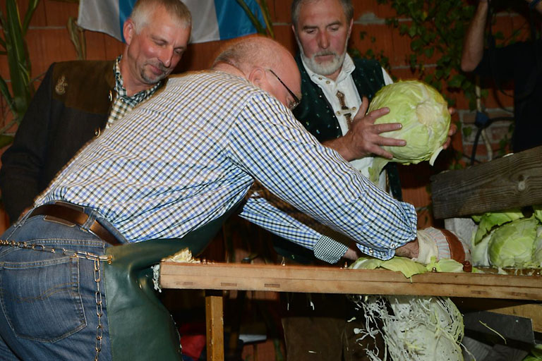 (ty) Unglaubliche 24,9 Kilogramm Weißkraut wurden 2013 innerhalb von nur 90 Sekunden gehobelt – ob der Rekord beim diesjährigen Krautfest in Unsernherrn fällt? Die Besucher des Hoffestes können es am Samstag, 11. Oktober, ab 18 Uhr live erleben, wenn der Nachfolger von Michael Rehm als Krautkönig gekürt wird. Passend zum Schwerpunktthema "Bienen – die fliegende Landwirtschaft" wird anschließend auch noch eine "Bienenkönigin" gekürt – jede Menge Unterhaltung also und natürlich auch Blasmusik, Bier und regionale Schmankerl – zum ersten Mal auch von der Regionalvermarktung "Vier Gärten".