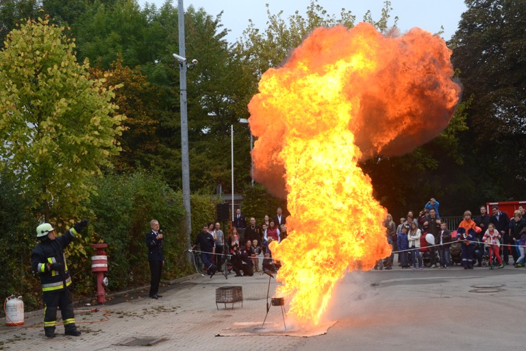 Besonders eindrucksvoll war für die meisten aber sicher die Fettexplosion, die vorgeführt wurde. Da wurde wohl auch dem Letzten klar, dass man einen Fettbrand niemals mit Wasser zu löschen versuchen sollte. Nur etwa zwei Schnapsgläser voll wurden zur Demonstration in den im Hof der Feuerwache inszenierten Fettbrand gekippt – und die Flammen schossen meterhoch in den Himmel. Dieses infernalische Bild hat sich vermutlich in die Gedächtnisse der Besucher eingebrannt – sie wissen nun, warum man einen Fettbrand ersticken soll und ihm keinesfalls mit Wasser zu Leibe rücken darf. Sie können die Vorführung anhand unserer Bilderserie und per Video-Mitschnitt nachvollziehen; die finden Sie hier: Darum sollten Sie einen Fettbrand nie mit Wasser löschen