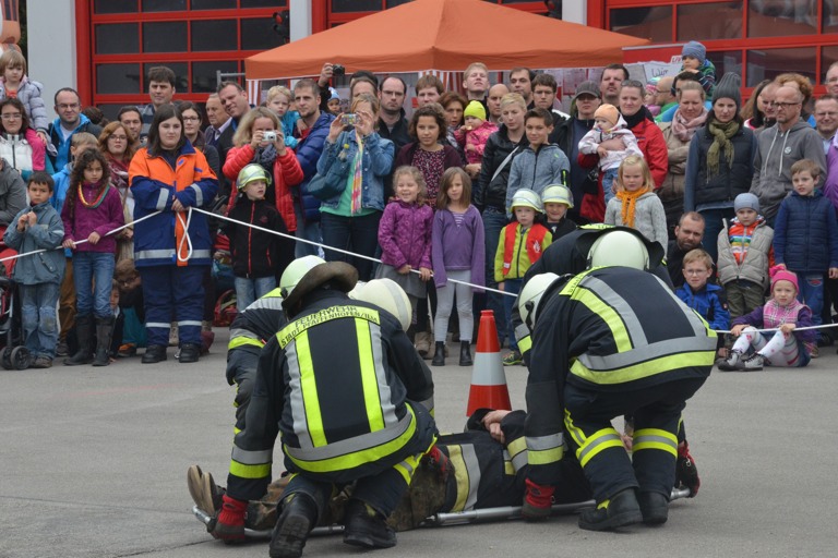 Da wurde zum Beispiel gezeigt, wie Schritt für Schritt eine eingeklemmte Person aus einem Auto gerettet wird – mittels hydraulischem Spreizgerät und weiterer Ausrüstung. Am Ende – nach gut einer Viertelstunde – war das Auto dann ein Cabrio, weil das Dach abgeschnitten wurde, und der „Verletzte“ wurde unter Applaus auf der Trage abtransportiert.