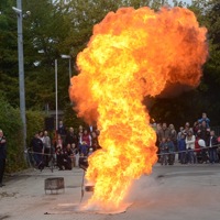 (ty) Warum man bei einem Fettbrand niemals versuchen sollte, mit Wasser zu löschen, wurde heute beim Tag der offenen Tür der Pfaffenhofener Feuerwehr eindrucksvoll gezeigt und erklärt. Nur etwa zwei Schnapsgläser voll wurden zur Demonstration in den im Hof der Feuerwache inszenierten Fettbrand gekippt – und die Flammen schossen meterhoch in den Himmel. Dieses infernalische Bild hat sich vermutlich in die Gedächtnisse der Besucher eingebrannt – sie wissen spätestens seit heute, warum man einen Fettbrand ersticken soll und ihm keinesfalls mit Wasser zu Leibe rücken darf. Denn durch die Hitze des Fettbrands wird das Wasser zu Dampf – aus einem Liter Wasser entstehen schlagartig fast 1700 Liter Wasserdampf. Unsere Bilderserie zeigt die Vorführung, die diesbezüglich keine Fragen offen ließ.