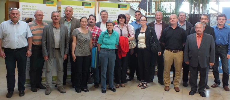 (ty) Eine Reise ins Donaumoos unternahmen Bürgermeister aus 15 niederbayerischen Gemeinden, um sich über den Donaumoos-Zweckverband und das von ihm angebotene Ökoflächenmanagement zu informieren. Die Kommunen liegen allesamt im nördlichen Landkreis Straubing-Bogen und schlossen sich 2009 zur kommunalen „Arbeitsgemeinschaft für Integrierte Ländliche Entwicklung“ (ILE nord23) zusammen. Karlshulds Bürgermeister Karl Seitle nahm die Gäste an der Umweltbildungsstätte „Haus im Moos“ in Empfang und gab einen kurzen Überblick über seine Gemeinde. Im Brennpunkt des Interesses aber stand das Ausgleichsflächenmanagement des Donaumoos-Zweckverbands. Mitarbeiter Michael Hafner ließ die Entscheidungsträger durch seinen Vortrag wissen, welche wirtschaftlichen, ökologischen und verwaltungstechnischen Vorteile ein solches Instrument für die Regionalentwicklung und die Gemeinden selbst bietet. Ein Besuch des Freilichtmuseums mit dem dortigen Wisent-Gehege und der bereits angelegten Ökoflächen rundeten den eintägigen Erfahrungsaustausch ab.