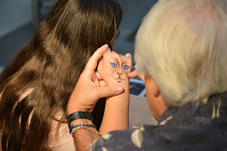 Heute, Samstag, um 15 Uhr kann man dem Künstler noch einmal live bei der Arbeit zusehen, wie eine Hand nach und nach zu einem Kunstwerk wird. Bis zu einer dreiviertel Stunde dauern die „einfachen“ Kunstwerke. Aber es kann schon auch mal mehrere Stunden in Anspruch nehmen, bis so ein Handbild fertig ist.