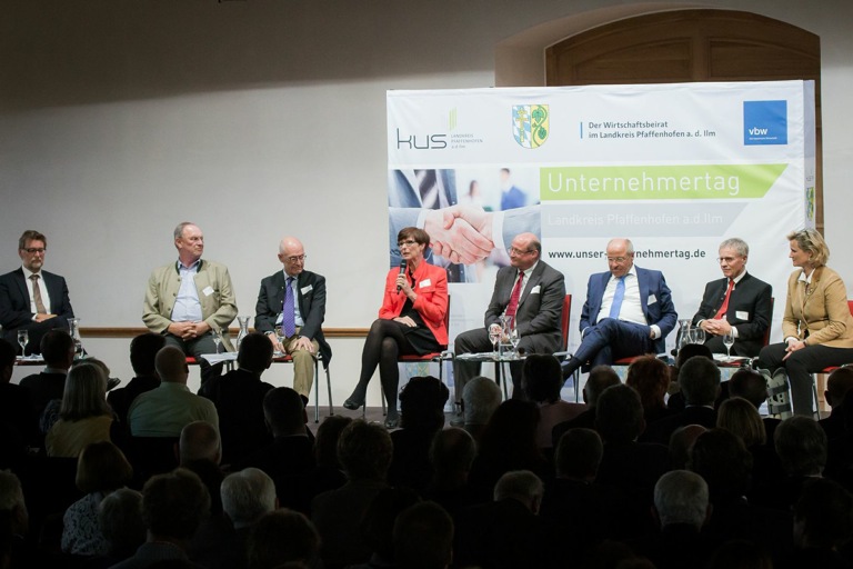 Bei der anschließenden Podiumsdiskussion standen die beiden Hauptreferenten der Moderatorin Elke Christian, Leiterin der IHK-Geschäftsstelle Ingolstadt, Rede und Antwort. Ergänzt wurde die Runde durch Landrat Martin Wolf (CSU), Wirtschaftsbeiratschef Bernd Huber, IHK-Nachfolgeberater Markus Neuner sowie drei betroffene Gewerbetreibende.