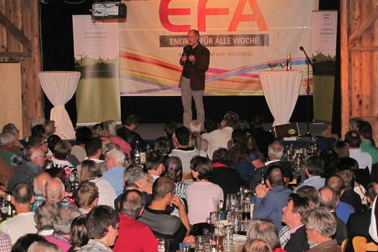 Vor den Informationen über das Bürger-Windrad begeisterte der aus Funk und Fernsehen bekannte Professor Harald Lesch die rund 300 Besucher im rappelvollen Stockerstadl mit einem Vortrag rund um die Themenfelder Energiewende und Klimaschutz. Und Lesch sprach, wie man ihn kennt, Klartext: „Mit der Kernkraft haben wir uns vor 60 Jahren für die falsche Richtung entschieden”, leitete der Professor seinen Vortrag ein. Die zentrale Aussage des knapp einstündigen Impulsreferats von Lesch war ein unmissverständliches Plädoyer für Sonnenenergie und Windkraft: „Wir wären eine wahrlich blöde Spezies, wenn wir so weiter machen und fossile Rohstoffe verbrennen, während uns Sonnenenergie und Wind ewig zur Verfügung stehen.“