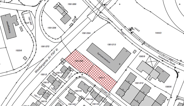 Auf den beiden rot markierten Grundstücken ist das Wohnheim geplant.