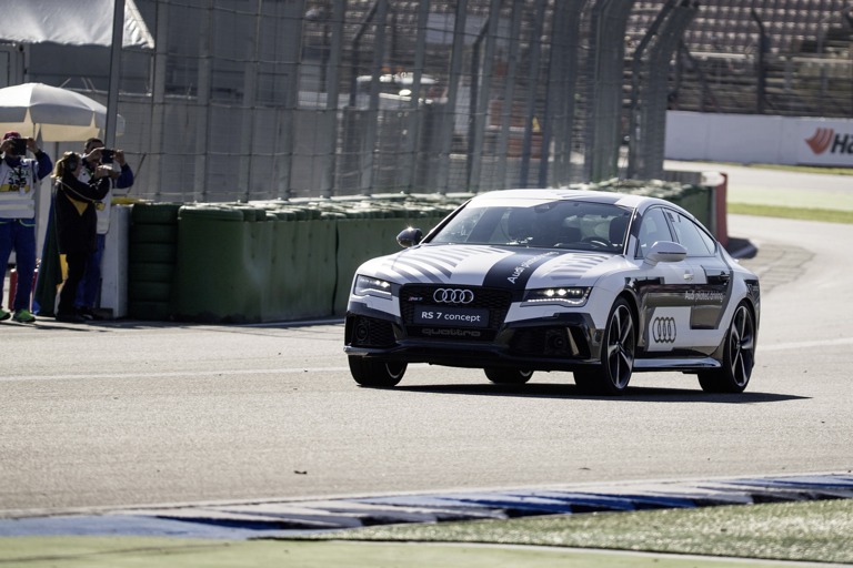 Der "Audi RS 7 piloted driving concept" fährt zur Demonstration der Fähigkeiten auf dem Hockenheimring eine saubere Rennlinie – mit Vollgas auf den Geraden, mit Vollbremsungen vor den Kurven, mit präzisem Einlenken und mit perfekt dosiertem Gaseinsatz am Kurvenausgang.