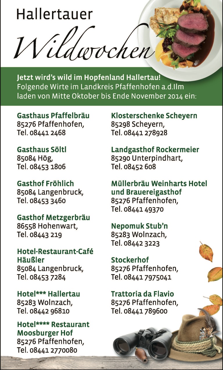 „Der Auftakt der Hallertauer Wildwochen war ein rundum gelungener Abend“, wertete zum Beispiel ein Gast aus Manching die Veranstaltung, der bisher nach eigenen Worten „eher selten“ in den Genuss von Wildfleisch gekommen war. Wer ebenfalls Lust bekommen hat, eine der vielfältigen Wildspezialitäten zu probieren – die Hallertauer Wildwochen laufen noch bis Ende November. Im Landkreis nehmen 13 Wirte teil. Weitere Infos gibt es beim KUS unter Telefon (0 84 41) 40 07 4- 40 oder im Internet unter www.hopfenland-hallertau.de.