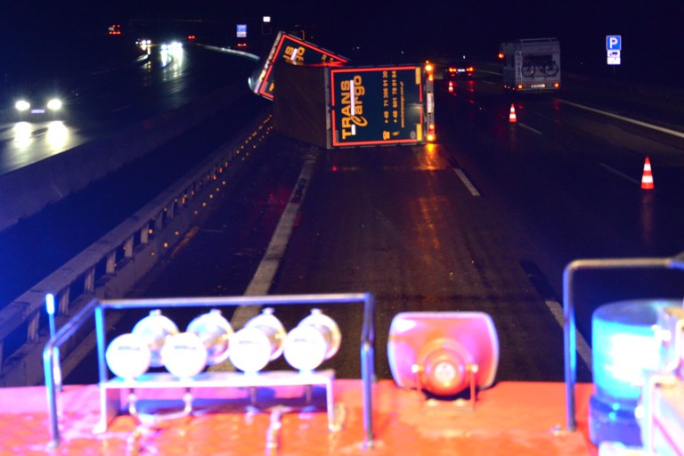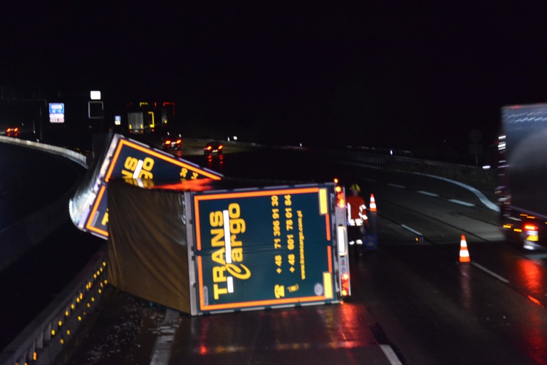 (ty) Die heftigen Sturmböen, die mit über 100 km/h durch die Region fegten, haben heute Abend nicht nur unzählige Bäume umgeknickt, sondern auch einen Lastwagen samt Anhänger auf der Autobahn A9 regelrecht umgeweht. Zwischen der Rastanlage Holledau und der Ausfahrt Pfaffenhofen in Fahrtrichtung Süden kam es zu dem Unglück.