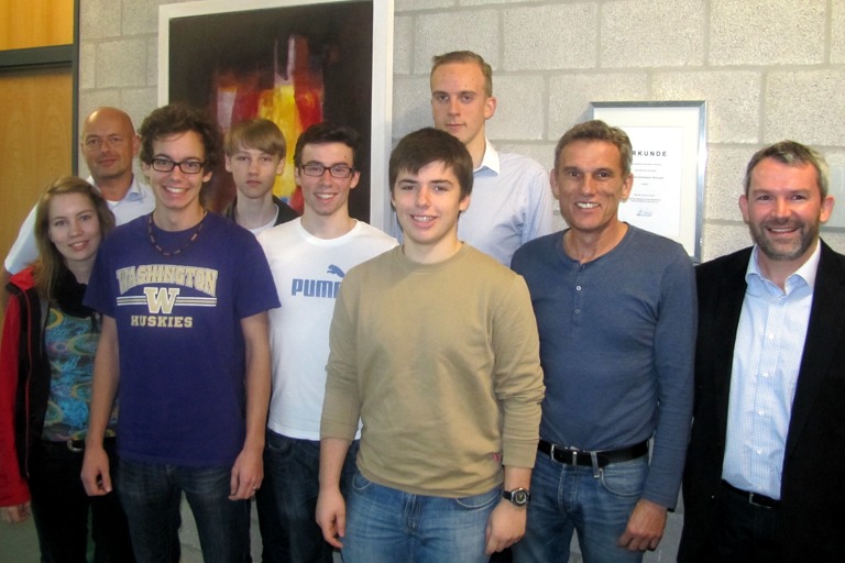 Kurz vor der Übergabe des Schecks die bereits freudig gestimmten Schüler und Lehrer: Links hinten Schulleiter Christian Heller, rechts vorne die beiden Betreuungslehrer Alfred Feistenberger und Markus Fiederer.